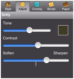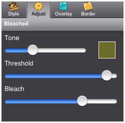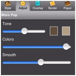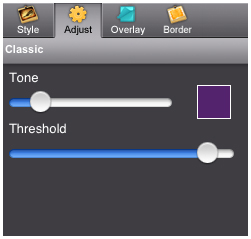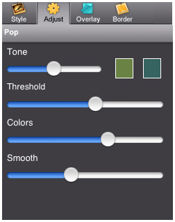 Tone SliderMoving this slider right increases the strength of the tone globally. Most of the effects use one color box but some use two. To change the color (tone) of the image, tap on the color box to get to the color picker. Threshold SliderThis slider darkens the shadows in the image. Colors SliderThis slider controls the colors used in the image and how strong the colors become. Smooth SliderControls how hard the edges are on the colors.